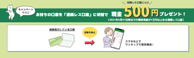 期間中に、お持ちの口座を「通帳レス口座」に切替で現金500円プレゼント