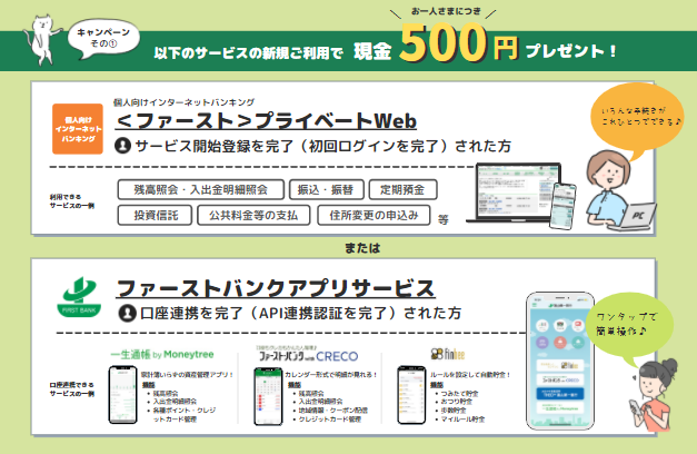 通帳レスへの切替には「<ファースト>プライベートWeb」または「ファーストバンクアプリサービス(「一生通帳 by Moneytree」 または 「ファーストバンク with CRECO」)」のご利用と、キャッシュカードの発行が必須です。