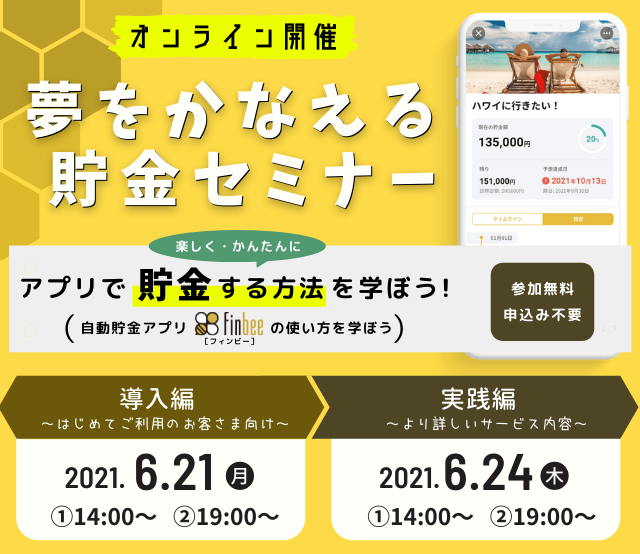 本セミナーでは、株式会社ネストエッグ(本社:東京都千代田区、代表取締役社長:田村 栄仁)が提供する自動貯金アプリ「finbee(フィンビー)」(以下、「finbee」といいます)を利用して、目標に向かって着実に貯金ができる方法をご紹介いたします。