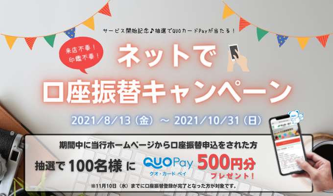 期間中に当行ホームページから口座振替申込をされた方を対象に抽選で、100名様にQUOカードPay500円分をプレゼント!