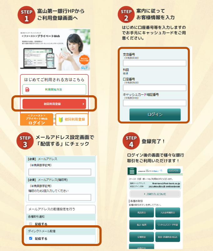 当行ホームページから個人向けインターネットバンキング「<ファースト>プライベートWeb」の初回利用登録を完了させる。(既に登録済みの方は必要ありません。)