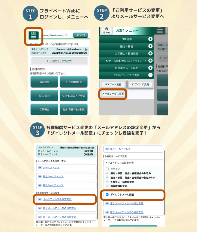 - 配信時点で当行口座を保有かつプライベートWeb上のダイレクトメール受信希望設定を「希望する」にしている方のみとなります。