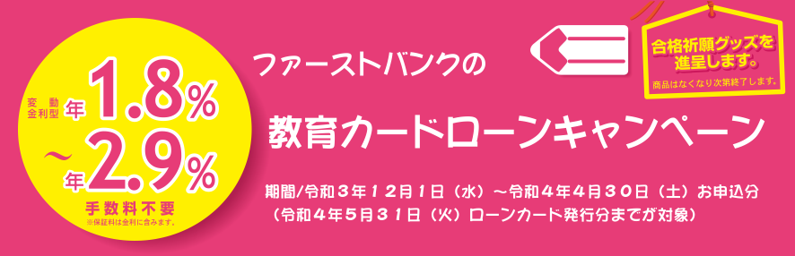 2021年12月1日(水)よりファーストバンクの「教育ローン(カードローン型)」キャンペーンを実施いたします。