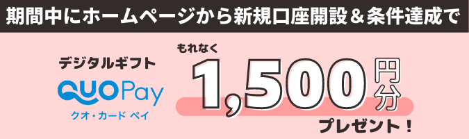 期間中にホームページから新規口座開設&条件達成で、もれなく全員にQUOカードPay1,500円分をプレゼント。