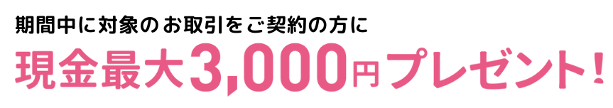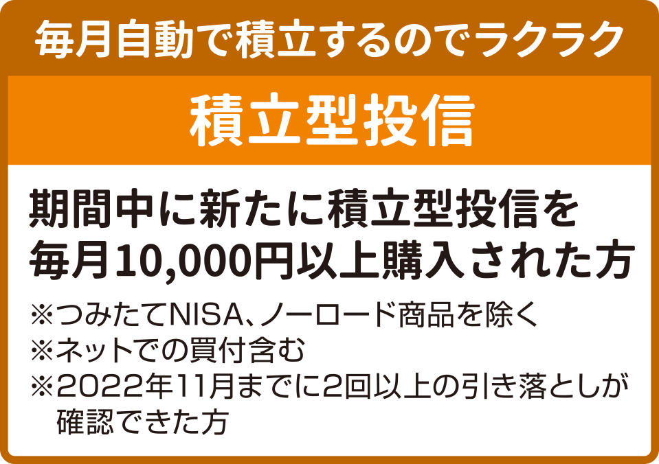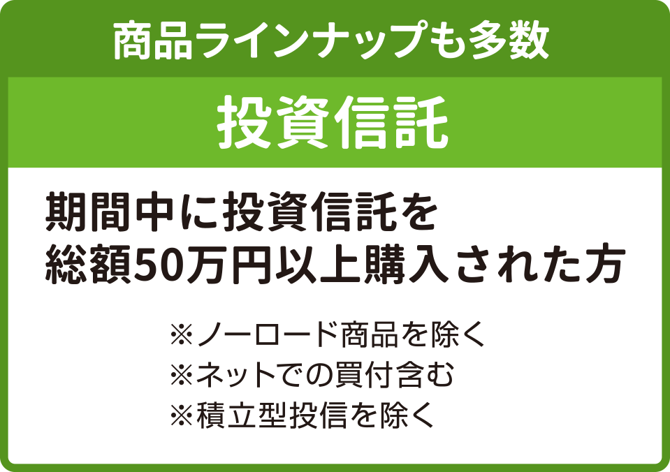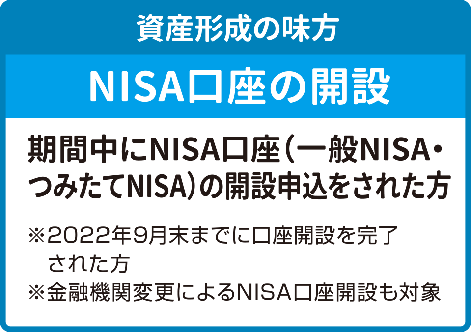 ●本キャンペーンは、個人のお客様が対象となります。●期間中に、対象のお取引をご契約いただくと、1項目につき現金1,000円プレゼントいたします。●それぞれの項目を単独で満たすことでキャンペーンの対象となることから、最大で3,000円の提供となります。●投資信託を窓口で購入される場合は、2022年9月30日(金)15時までに、インターネットバンキングを利用して購入される場合は、2022年9月30日(金)14時30分までにお手続きをしていただく必要があります。●プレゼントは、2022年12月までに、投資信託指定口座に入金させていただく予定です。入金時に口座が解約となっている場合は対象外となります。●NISA口座の開設は、お申込後、書類のご確認、税務署への当行からの申請、税務署での開設確認等を経て口座開設となりますので、1カ月程度お時間をいただいております。あらかじめ、ご了承ください。●詳しくは窓口へお問合わせください。