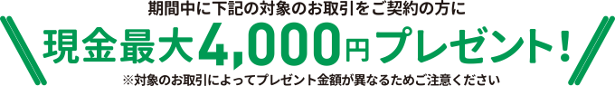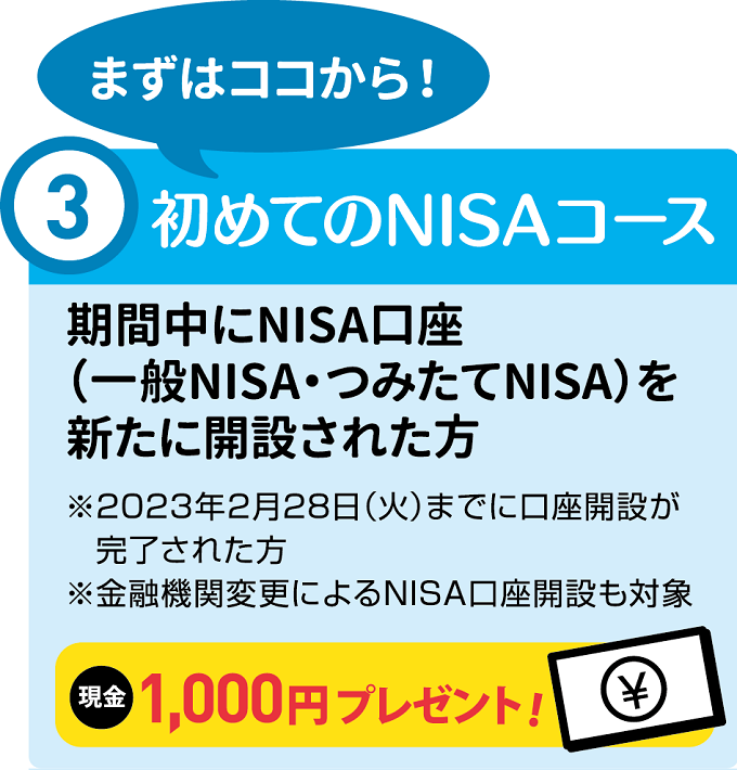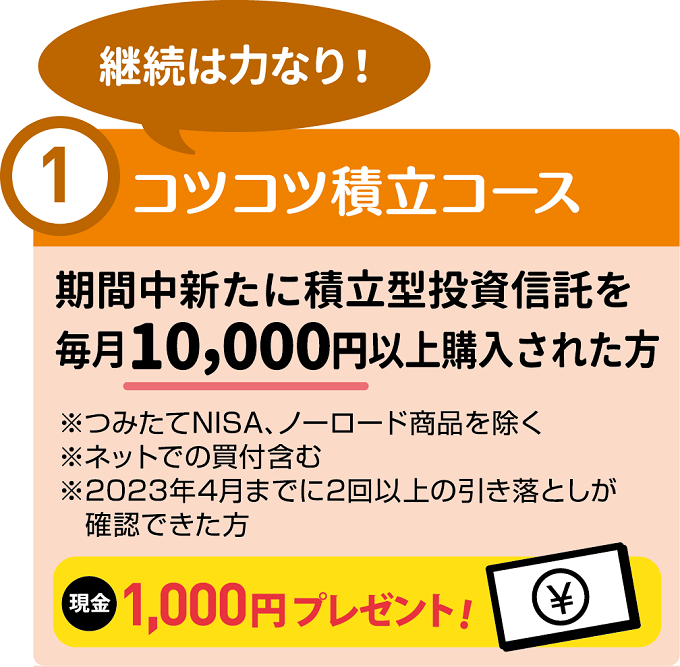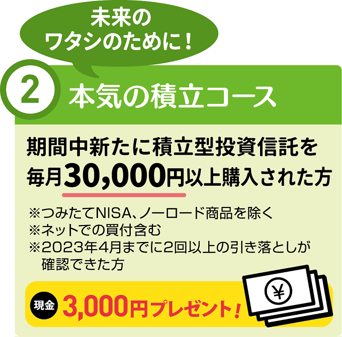 ●本キャンペーンは、個人のお客様が対象となります。●期間中に対象のお取引いただくと、①、③は1,000円、②は3,000円をプレゼントいたします。①または②の適用判定については、2022年11月21日(月)~2023年2月28日(火)における月間積立金額の上位2回を基に判定し、対象者の判定は、キャンペーン期間終了時点において、10,000円以上または30,000円以上の新たな買付(増額)申込が確認できることとします。但し、①と②を併せて利用することはできません。本キャンペーンでは最大で4,000円の提供となります。●投資信託を窓口で購入される場合は、2023年2月28日(火)15時までに、インターネットバンキングを利用して購入される場合は、2023年2月28日(火)14時30分までにお手続きを済ませる必要があります。●プレゼントは、2023年5月までに、投資信託指定口座に入金させていただく予定です。入金時に口座が解約となっている場合は対象外となります。●NISA口座の開設は、お申込後、書類のご確認、税務署への当行からの申請、税務署での開設確認等を経て口座開設となりますので、1カ月程度お時間をいただいております。あらかじめ、ご了承ください。●詳しくは窓口へお問合わせください。
