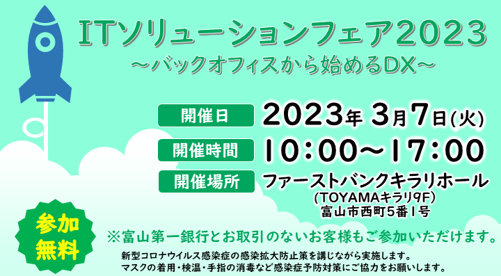 この度、富山第一銀行は、デジタル技術の活用に関する情報を広くお客様へ発信し、事業や業務の変革を進める機会を作るイベントとして『ITソリューションフェア2023~バックオフィスから始めるDX~』を開催いたします。今年10月よりスタートするインボイス制度や来年1月よりスタートする改正電子帳簿保存法への対応はお済みでしょうか?また、勤怠管理などのバックオフィス業務の効率化をどうやっていいかわからないといったお悩みに対して、実際に見て触って解決方法を理解していただける内容となっています。