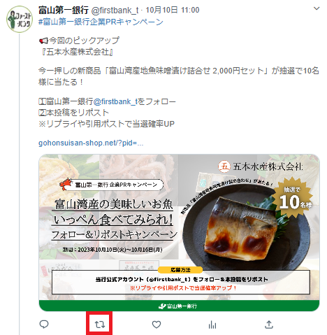 - 富山第一銀行(@firstbank_t)をフォローおよび指定のキャンペーンポストをリポストされた方の中から抽選で10名様に「富山湾産地魚味噌漬け詰合せ 2,000円セット」をプレゼントいたします!