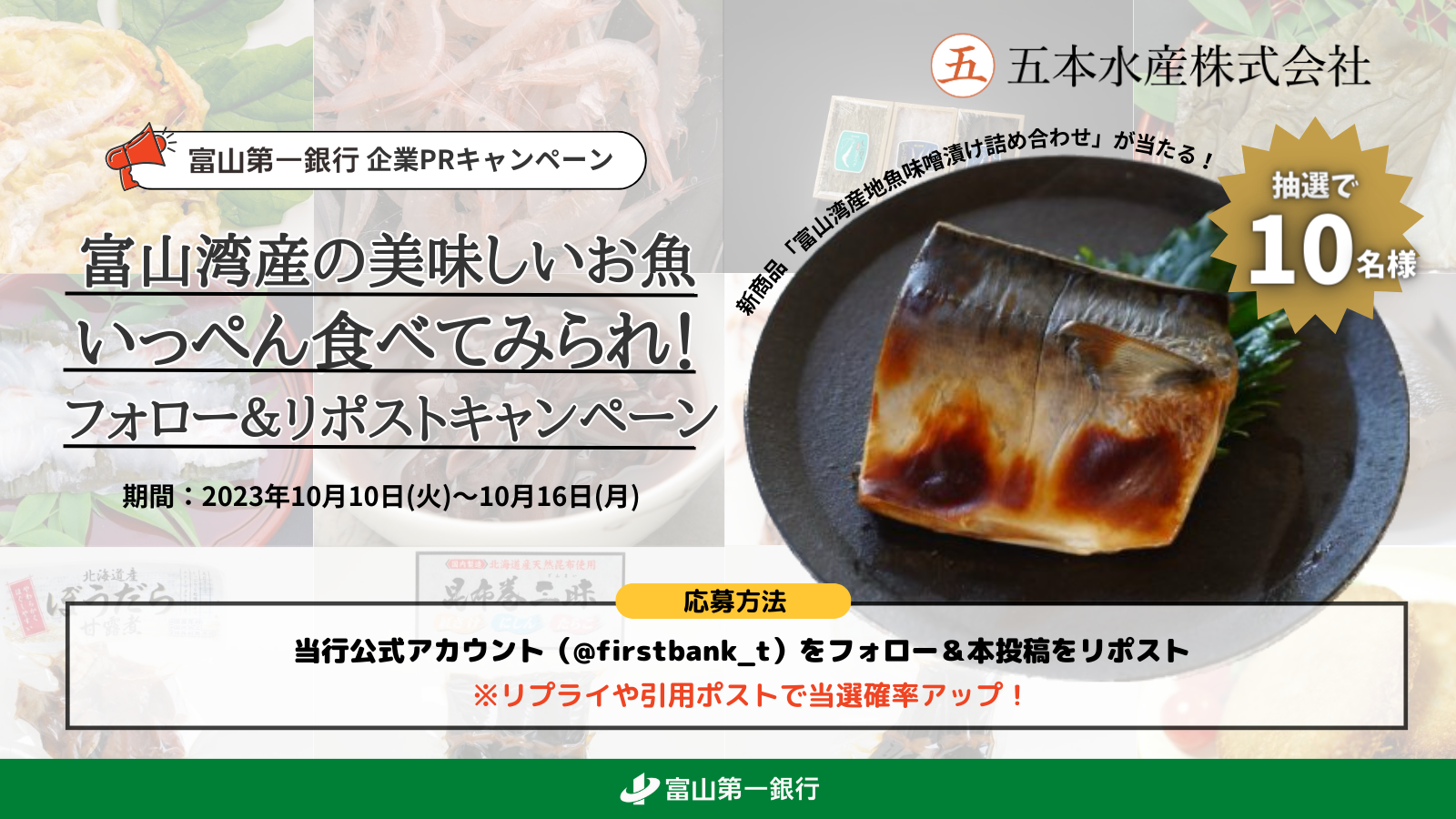 当行では「富山第一銀行企業PRキャンペーン」として、五本水産株式会社の商品をプレゼントするキャンペーンを当行公式X(旧Twitter)アカウント上で実施いたします。