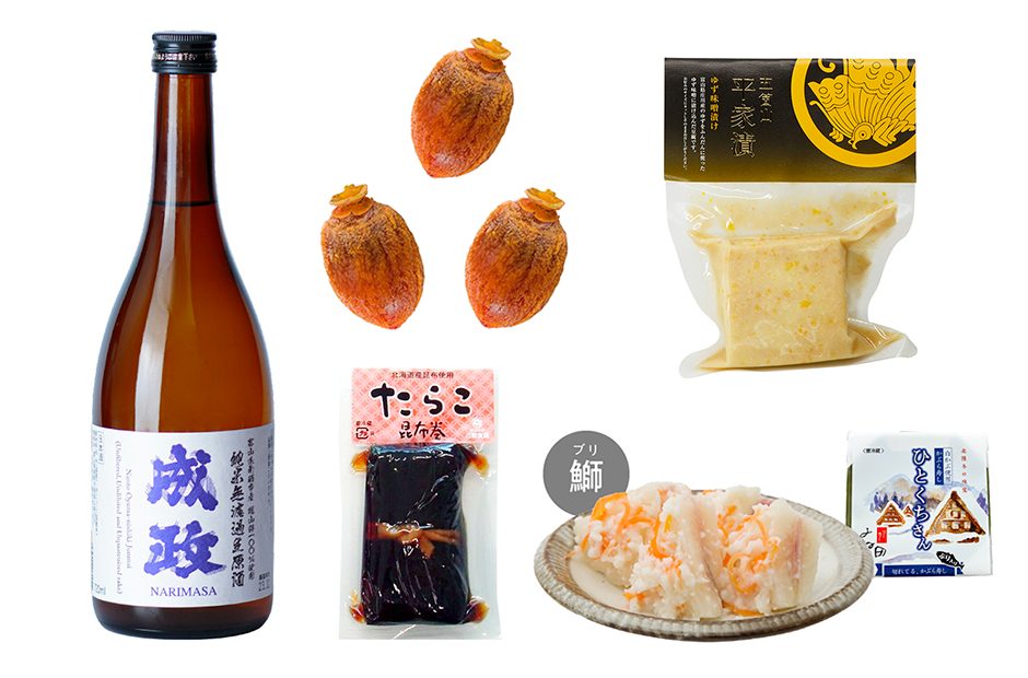 南砺市特産の「干柿」と冬の味覚「かぶら寿し」、冬季限定の搾りたての生酒と酒肴をセットにしました。年末年始のテーブルを彩る冬の贈り物、お取り寄せに最適です。フレッシュな「成政 雄山錦純米 無濾過生原酒」は「かぶら寿しにあう冬のお酒」とリクエストして成政酒造さんに薦めていただいたうちの1本。割り水一切なしのアルコール度数18度の生原酒なので、風味もガツン!のツウに好まれる冬の一品。また南砺では昔から「お酒を飲む前に干柿を食べれば悪酔いしない」と言われ、干柿はお酒のアテとしても長く愛されています。冬の食文化として楽しんでみてはいかがでしょう。