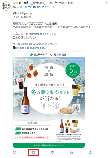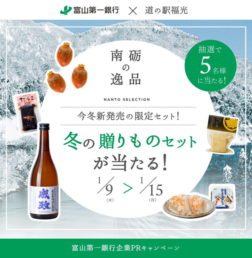- 富山第一銀行(@firstbank_t)をフォローおよび指定のキャンペーンポストをリポストされた方の中から抽選で5名様に"南砺の逸品"の「冬の贈りものセット」をプレゼントいたします!