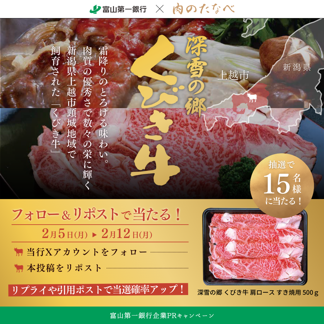 当行では「富山第一銀行企業PRキャンペーン」として、株式会社肉のたなべ様提供で、「深雪の郷 くびき牛(肩ロース すき焼き用)」をプレゼントするキャンペーンを当行公式X(旧Twitter)アカウント上で実施いたします。