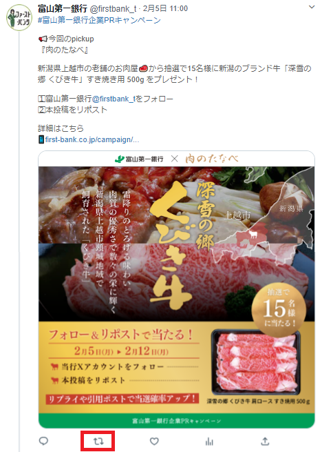 - 富山第一銀行(@firstbank_t)をフォローおよび指定のキャンペーンポストをリポストされた方の中から抽選で15名様に「深雪の郷 くびき牛(肩ロース すき焼き用)」をプレゼントいたします!