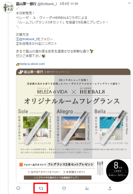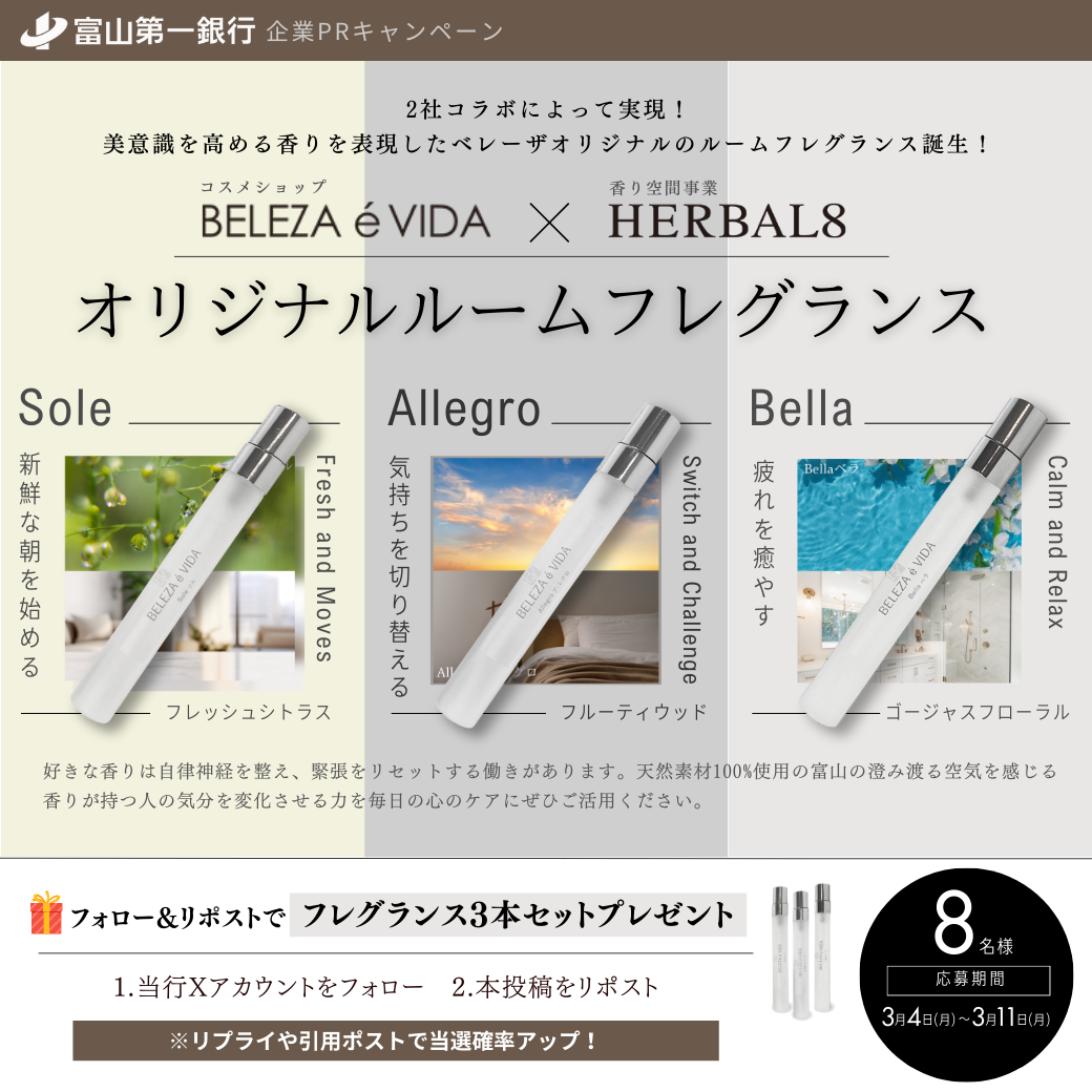 - 富山第一銀行(@firstbank_t)をフォローおよび指定のキャンペーンポストをリポストされた方の中から抽選で8名様にベレーザ・ エ・ヴィーダ × HERBAL8「オリジナルルームフレグランス3本セット」をプレゼントいたします!