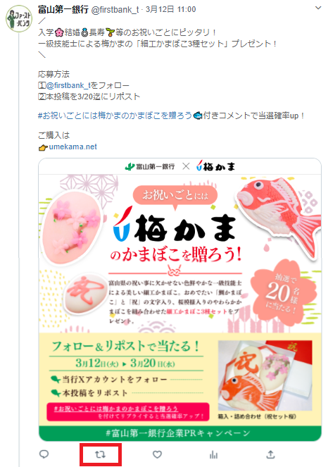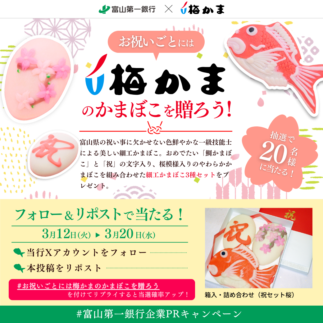 - 富山第一銀行(@firstbank_t)をフォローおよび指定のキャンペーンポストをリポストされた方の中から抽選で20名様に梅かまの「箱入・詰め合わせ(祝セット桜)」をプレゼントいたします!