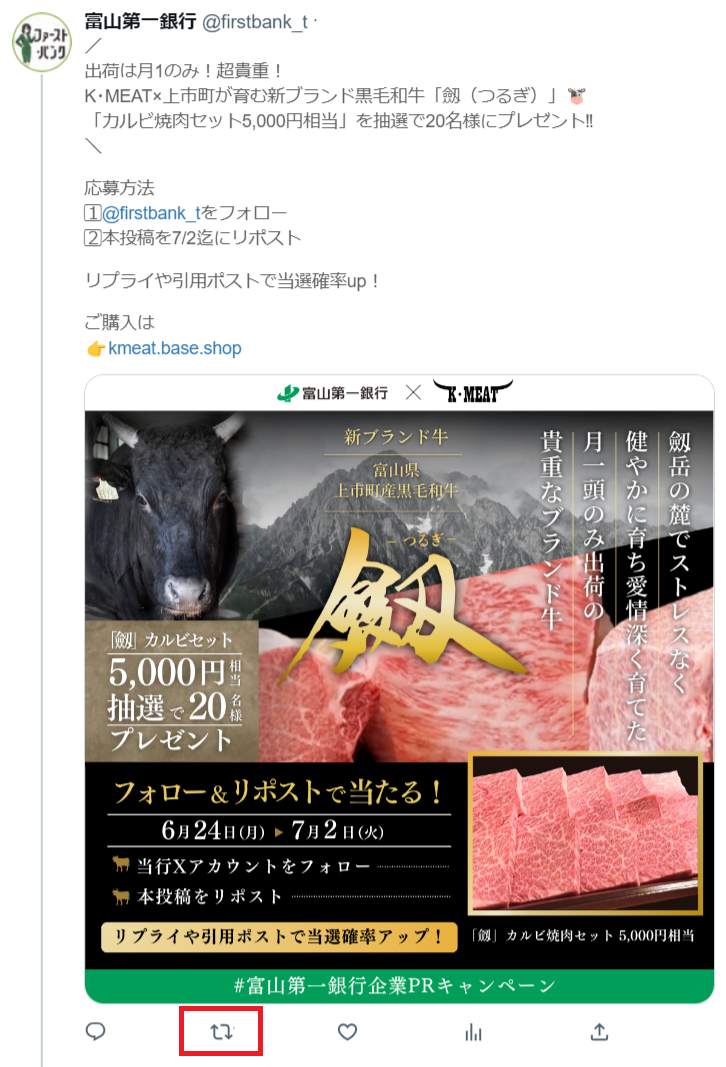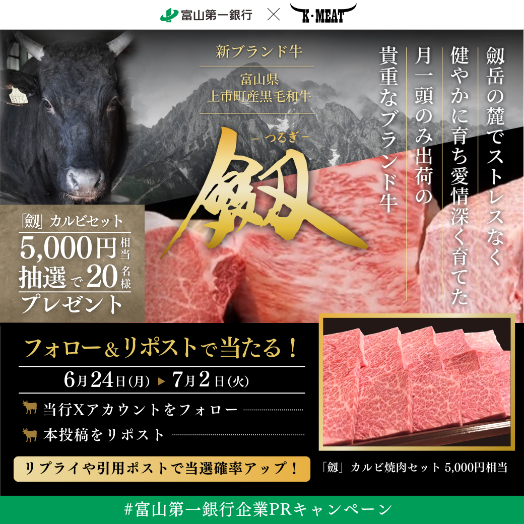 当行では株式会社K・MEATタイアップによる「新ブランド黒毛和牛『劔(つるぎ)』のカルビ焼肉セット5,000円相当」をプレゼントするキャンペーンを富山第一銀行公式X(旧Twitter)アカウント上で実施いたします。
