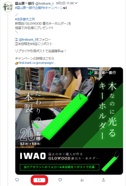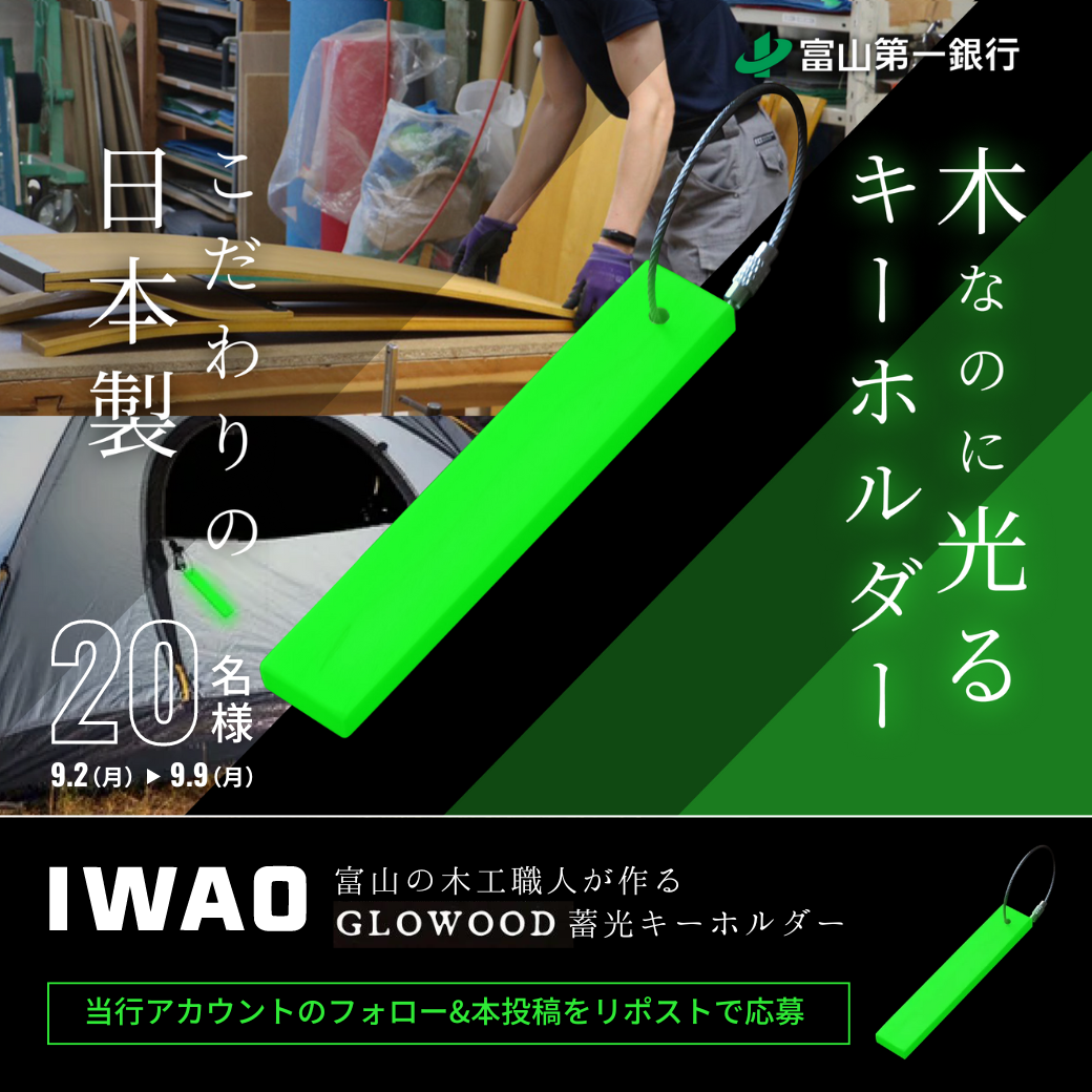 - 富山第一銀行(@firstbank_t)をフォローおよび指定のキャンペーンポストをリポストされた方の中から抽選で20名様に新商品「GLOWOOD 蓄光キーホルダー」をプレゼントいたします!