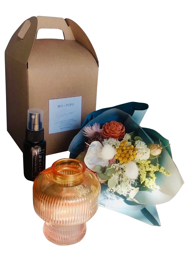 POPO3店舗では贈り物としてのお花だけでなく、ウエディングプランナーの資格を持つ店員によるウエディングフラワーの提案と作成。お花に囲まれたフォトブース。植物療法士がいる花屋カフェも。他にも、お客様に喜んでもらえるよう様々なアイテムを開発しております。今回は、新商品としてオリジナルブレンドで作成したアロマミストとドライフラワーのミニブーケ、フラワーベースを提供させていただきました。是非、この機会に試してみてください。