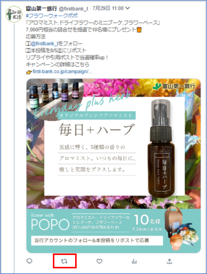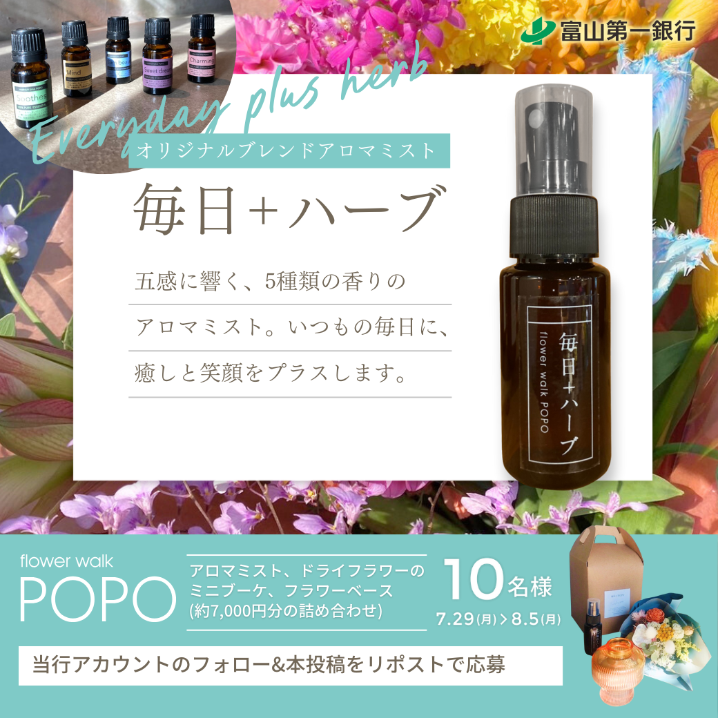 - 富山第一銀行(@firstbank_t)をフォローおよび指定のキャンペーンポストをリポストされた方の中から抽選で10名様にflowerwalkpopoの「アロマミストギフトセット」をプレゼントいたします!