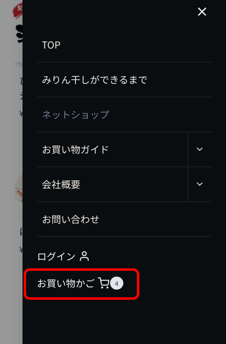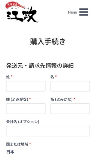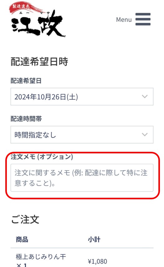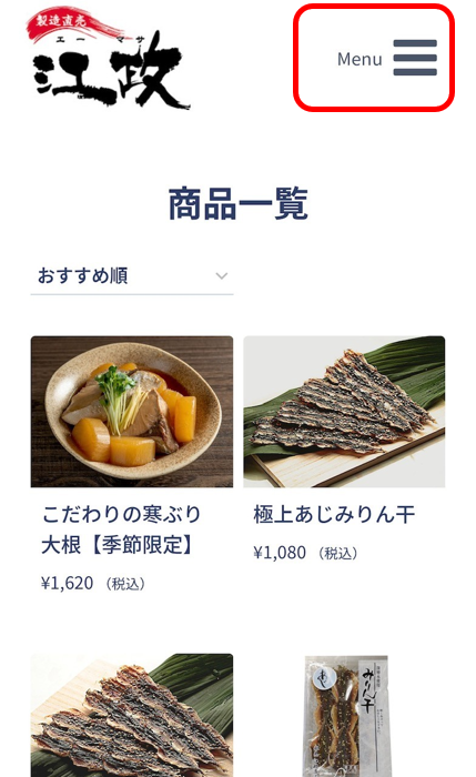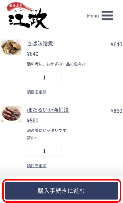 ➀江政商店オンラインストアから購入希望の商品を選択後「Menu」を選択