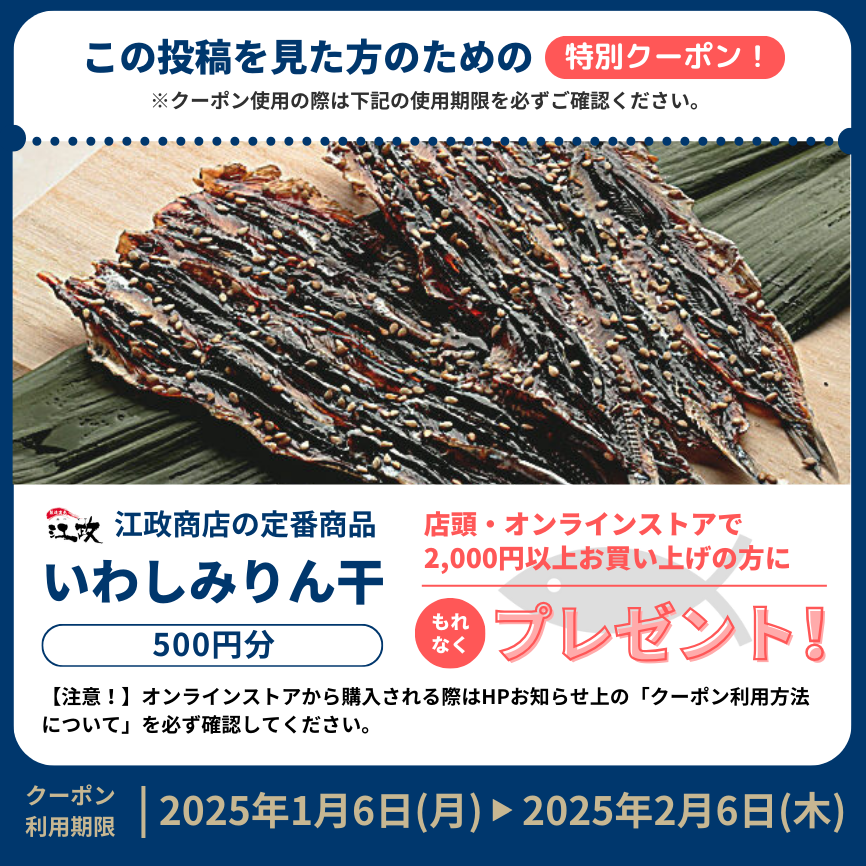 - キャンペーン開始から1ヶ月間(2025年1月6日(月)~2月6日(木))に、店頭・オンラインショップで使えるクーポン(2,000円以上の購入で「いわしみりん干」をプレゼント)を配布します。