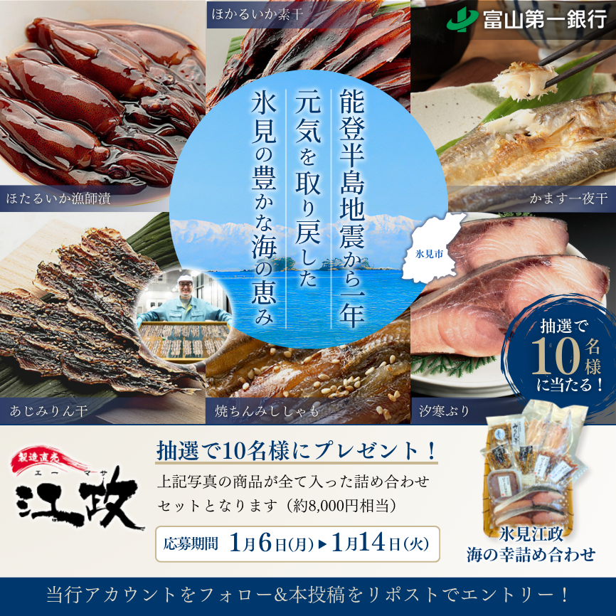 当行では「富山第一銀行企業PRキャンペーン」として、㈱江政商店様タイアップによる、人気商品を詰め合わせた「氷見江政 海の幸詰め合わせ」をプレゼントするキャンペーンを当行公式X(旧Twitter)アカウント上で実施いたします。