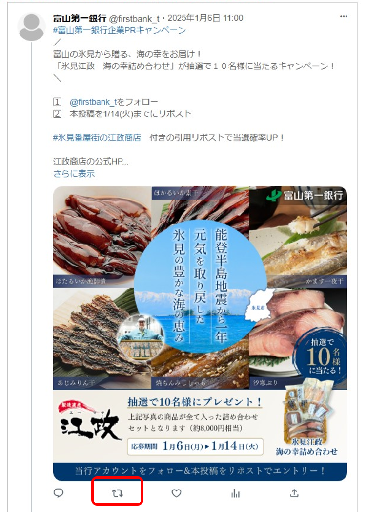 当行公式Xアカウント「江政商店の "氷見江政 海の幸詰め合わせ" が当たる!」フォロー&リポストキャンペーン実施について