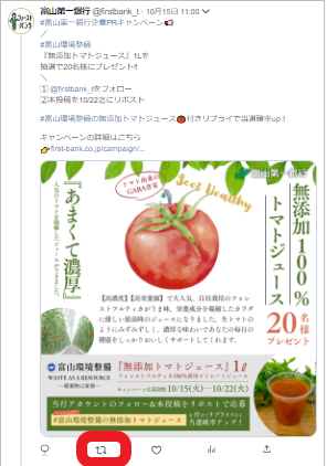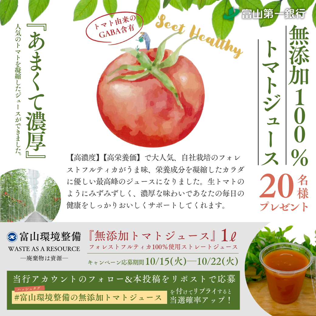 - 富山第一銀行(@firstbank_t)をフォローおよび指定のキャンペーンポストをリポストされた方の中から抽選で20名様に「無添加100%トマトジュース」1Lをプレゼントいたします!