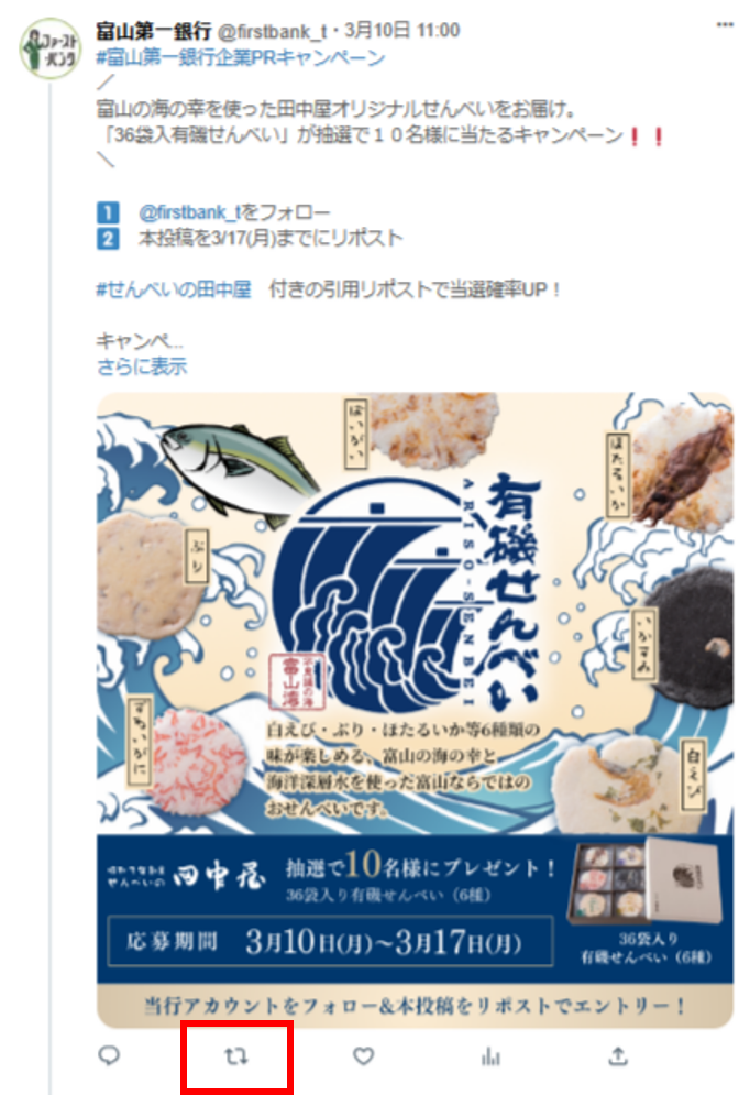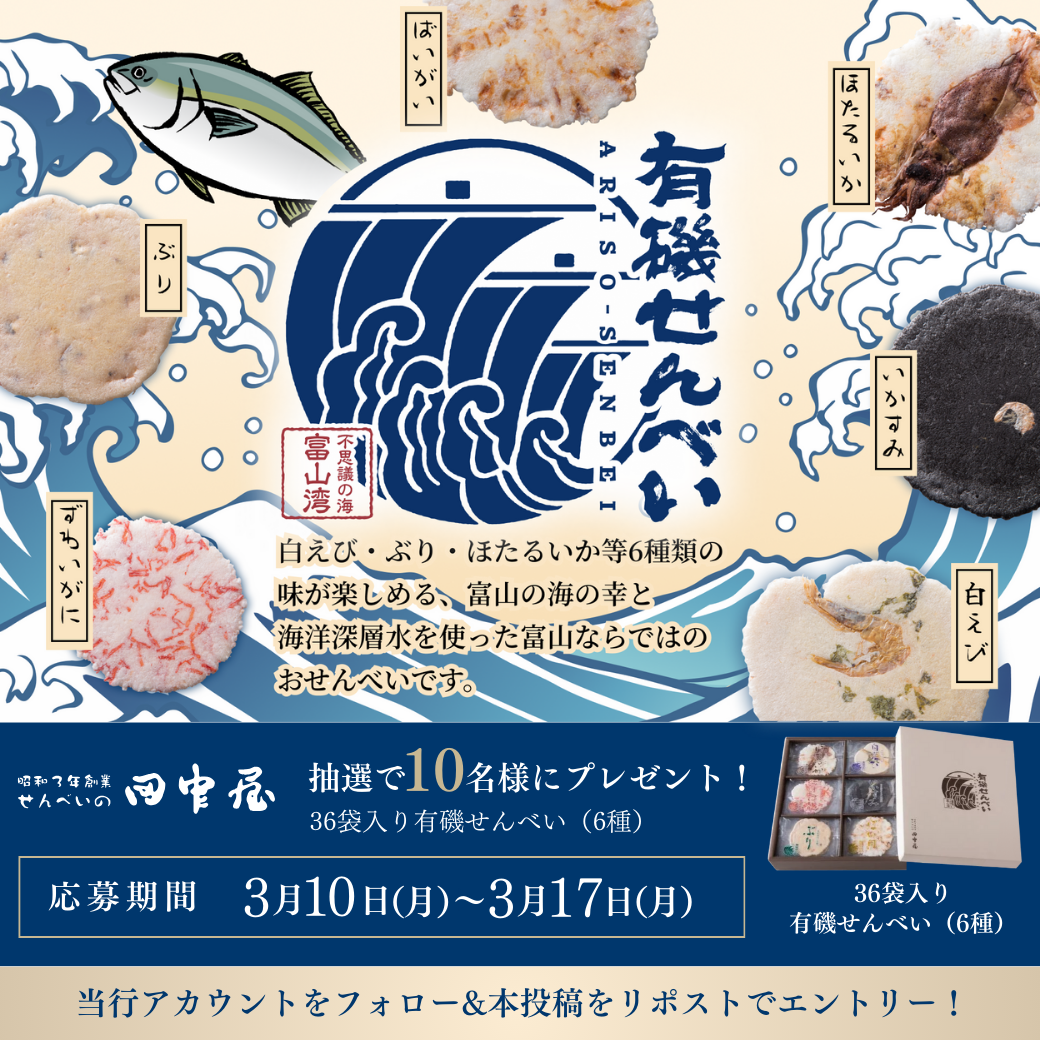 - 富山第一銀行(@firstbank_t)をフォローおよび指定のキャンペーンポストをリポストされた方の中から抽選で10名様にせんべいの田中屋様の「有磯せんべい(6種)」をプレゼントいたします!