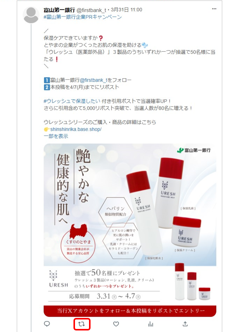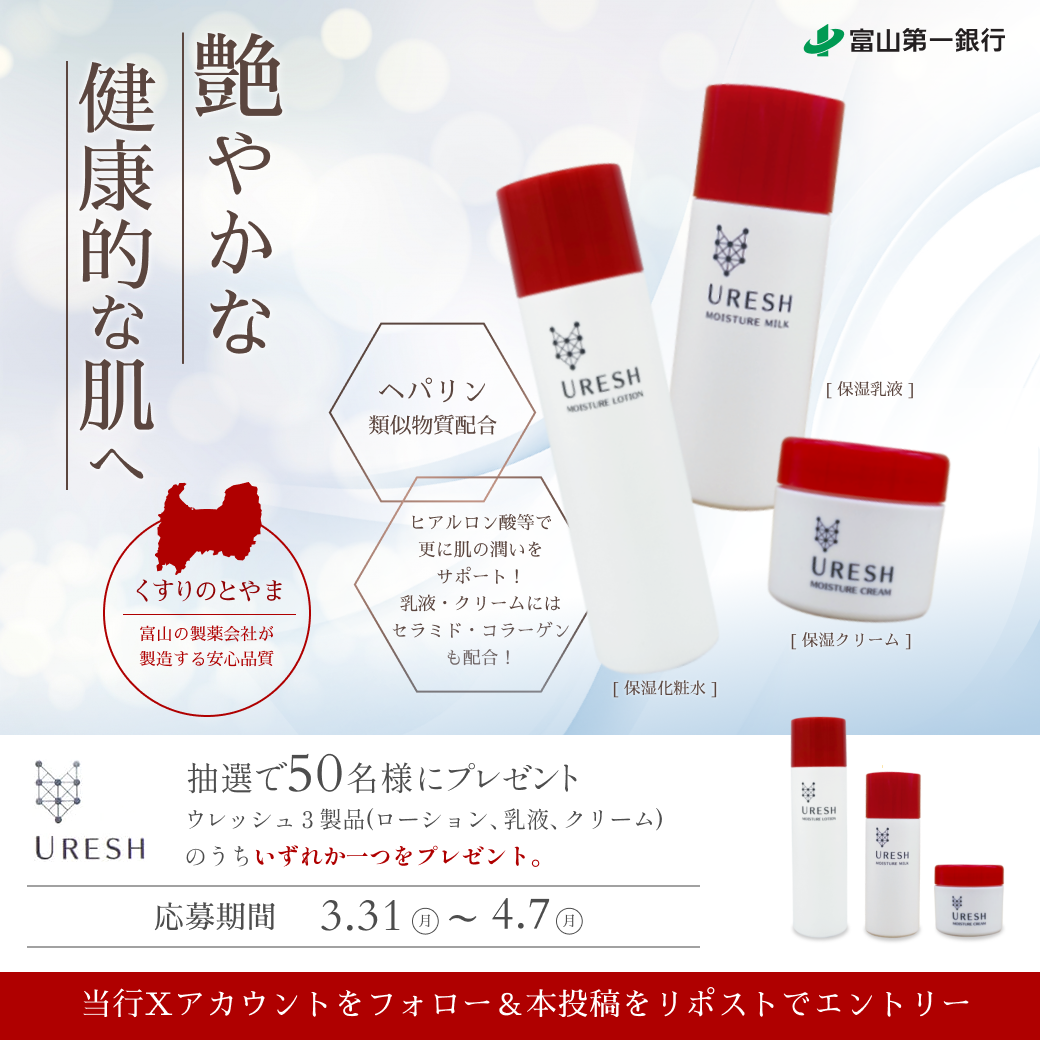 - 富山第一銀行(@firstbank_t)をフォローおよび指定のキャンペーンポストをリポストされた方の中から抽選で50名様に「「ウレッシュ」3製品のうちいずれか一つ」をプレゼントいたします!