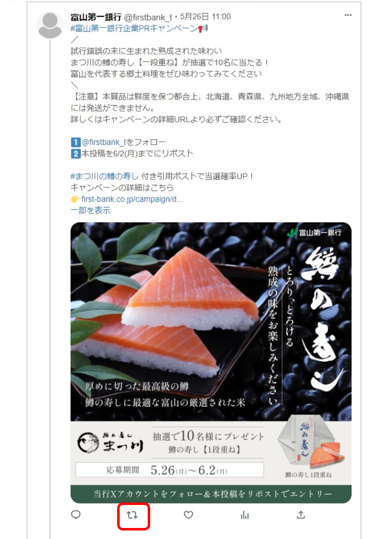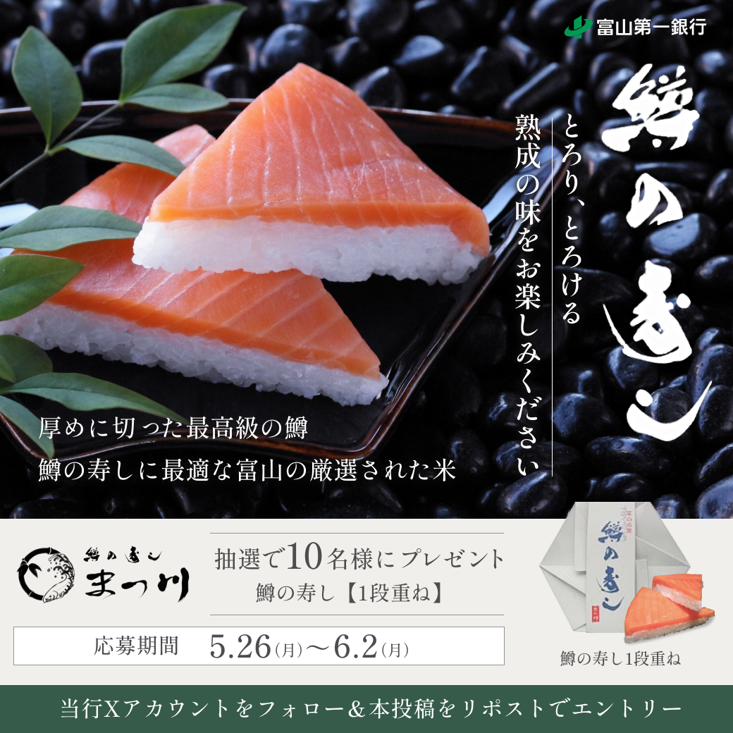 当行では「富山第一銀行企業PRキャンペーン」として、株式会社まつ川タイアップによる「鱒の寿し【一段重ね】」をプレゼントするキャンペーンを富山第一銀行公式X(旧Twitter)アカウント上で実施いたします。