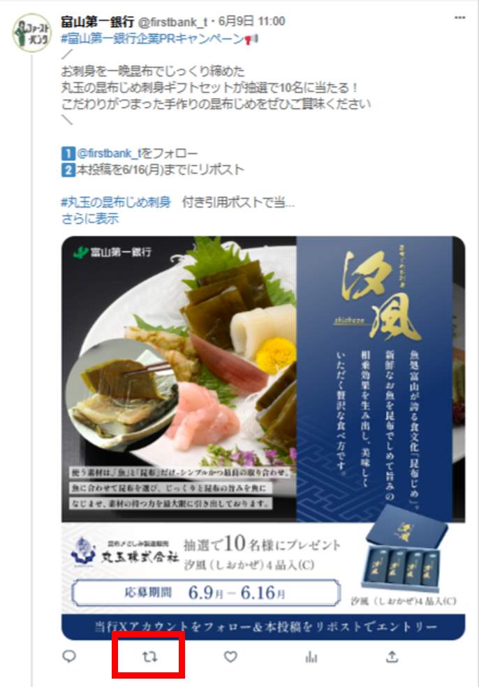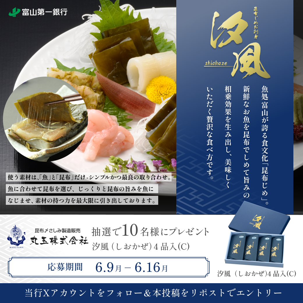 当行では「富山第一銀行企業PRキャンペーン」として丸玉株式会社様とのタイアップによる「丸玉の昆布じめ刺身ギフトセット」をプレゼントするキャンペーンを富山第一銀行公式Xアカウント上で実施いたします。
