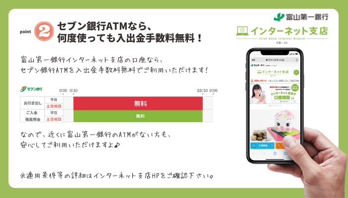point2:セブン銀行ATMなら、何度使っても入出金手数料無料!