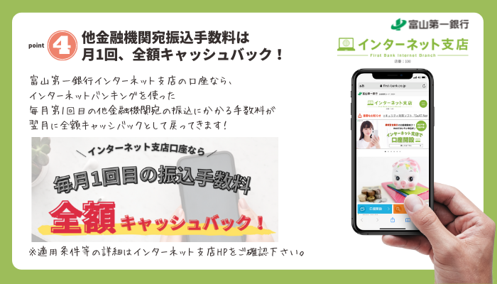 point4:当行以外への振込手数料は月1回、全額キャッシュバック!