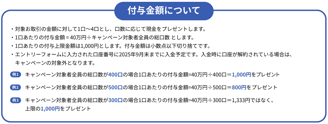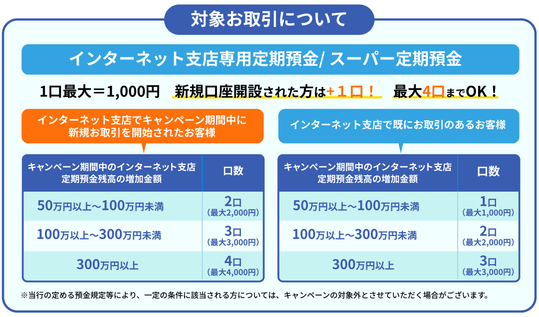 - キャンペーンの景品は、2025年9月末頃までにインターネット支店の普通預金口座へ入金予定です。入金時に口座が解約されている場合は、キャンペーン対象外となります。