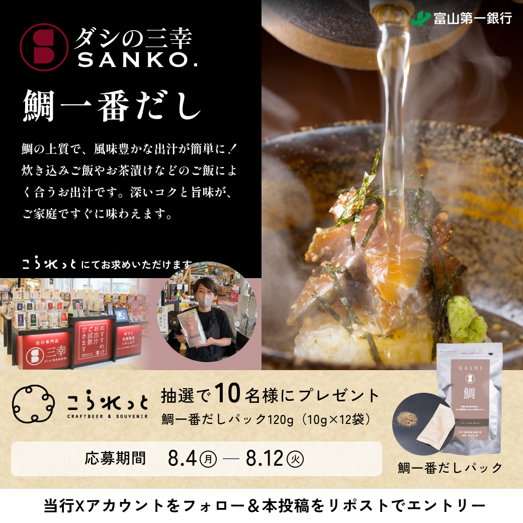 - 富山第一銀行(@firstbank_t)をフォローおよび指定のキャンペーンポストをリポストされた方の中から抽選で10名様に「ダシの三幸の鯛一番だし」1パックをプレゼントいたします!