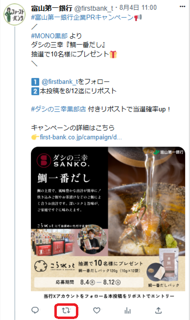 当行では「富山第一銀行企業PRキャンペーン」として、MONO黒部様とのタイアップによる「ダシの三幸の鯛一番だし」をプレゼントするキャンペーンを富山第一銀行公式X(旧Twitter)アカウント上で実施いたします。