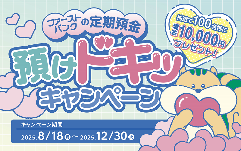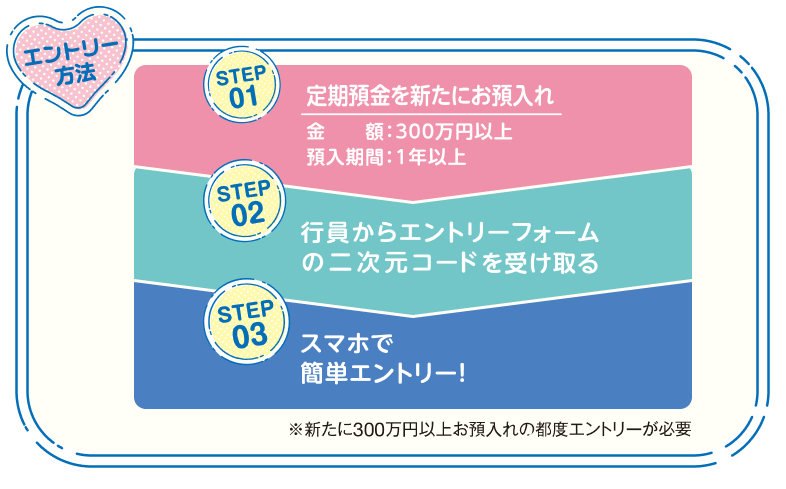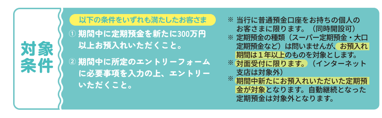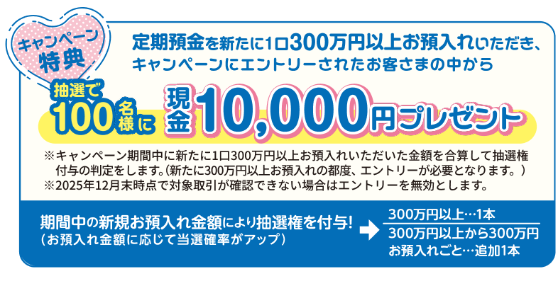 期間中、定期預金を新たに1口300万円以上お預入れいただき、キャンペーンにエントリーされたお客さまの中から、抽選で100名様に現金10,000円プレゼント。