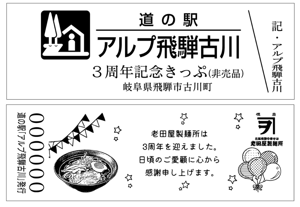 道の駅アルプ飛騨古川では老田屋製麺所の3周年を記念して、数量限定でプレゼントをご用意しております。また、「ただしくんのみそタンメン」が新発売されますので、ぜひお立ち寄りください。