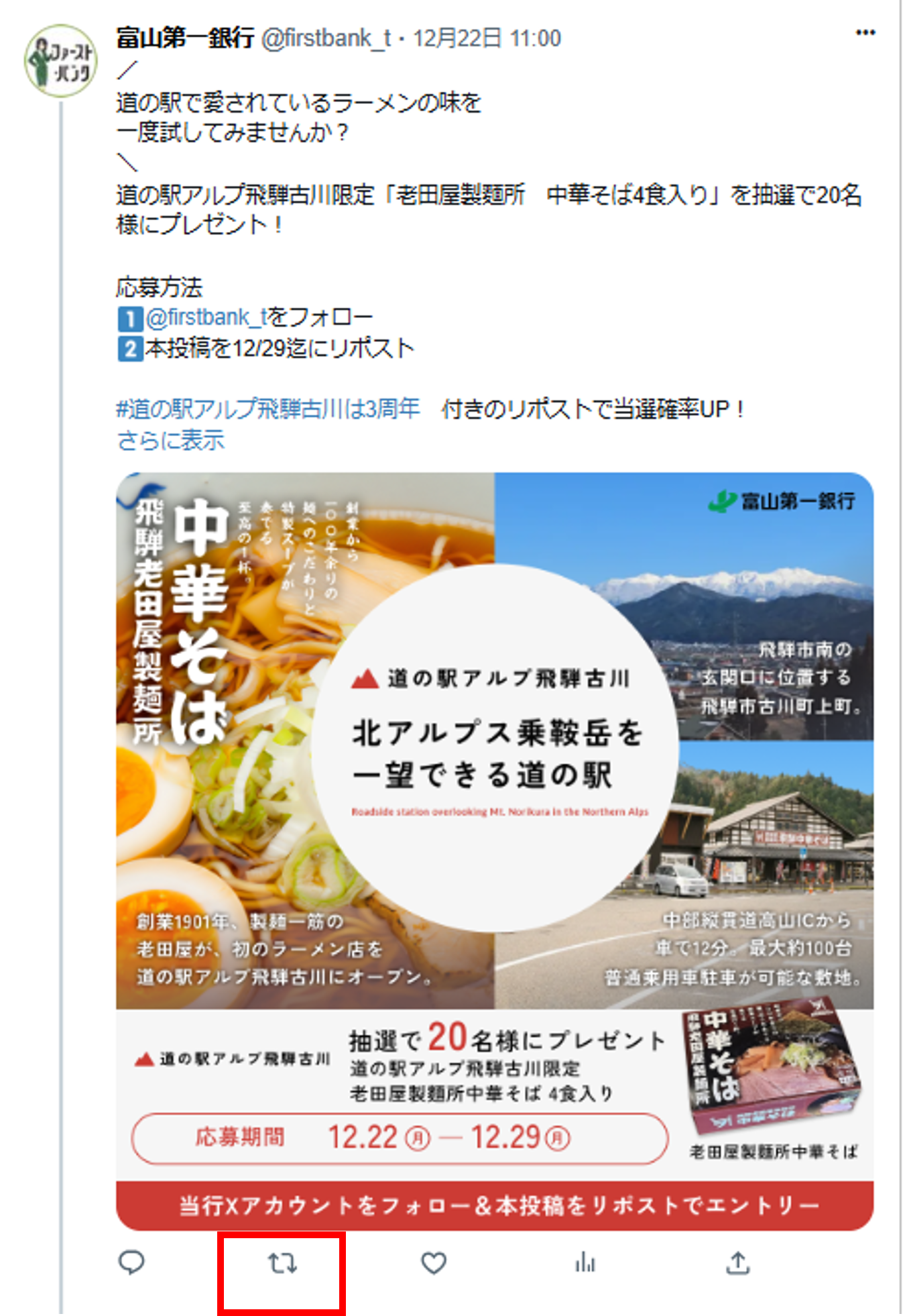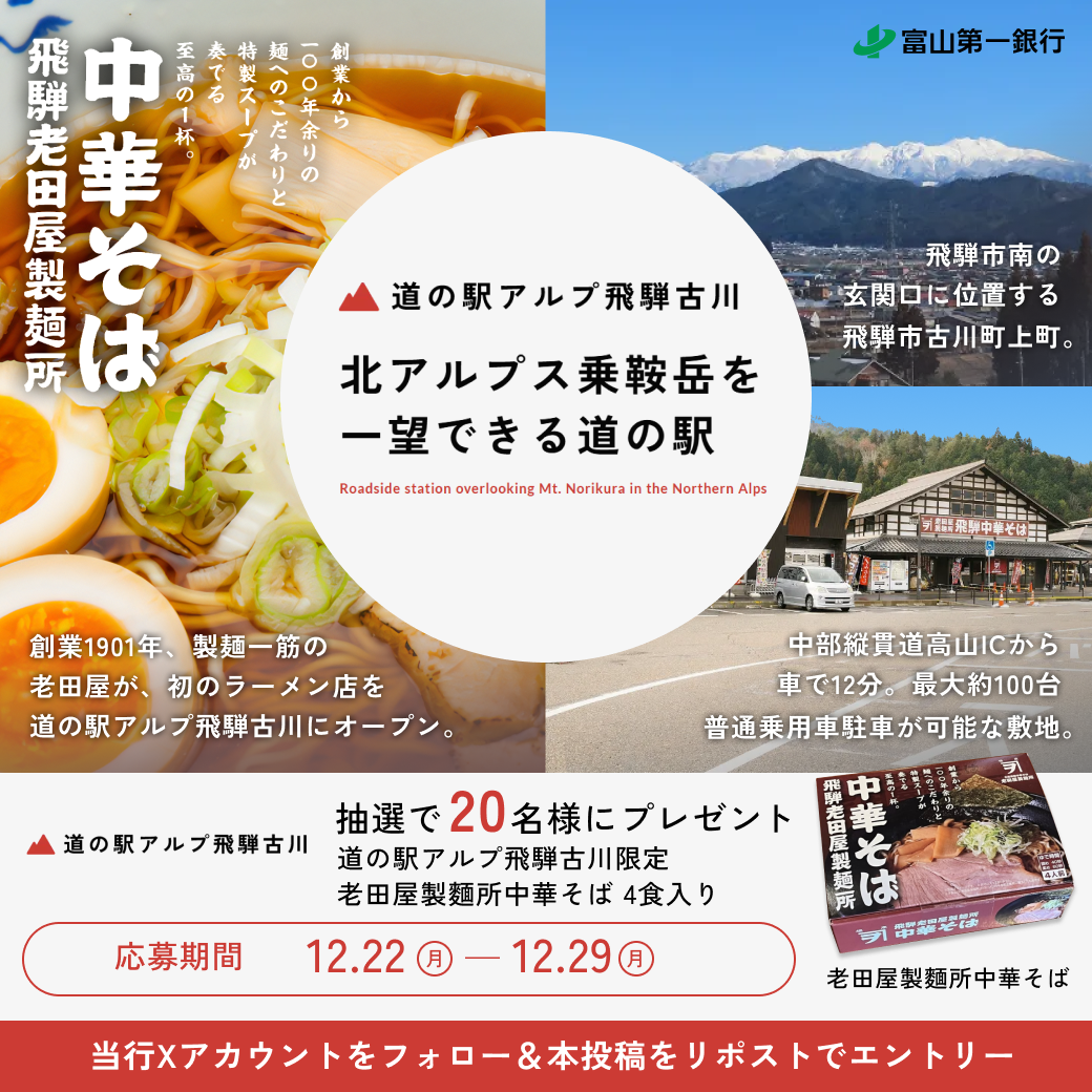 当行では道の駅アルプ飛騨古川様タイアップによる「老田屋製麺所中華そば(4食入り)」をプレゼントするキャンペーンを富山第一銀行公式Xアカウント上で実施いたします。