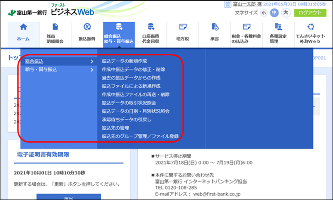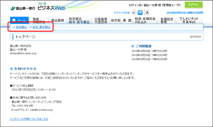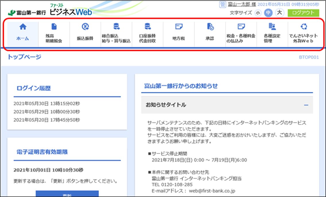 (1)ビジネスWebトップ画面