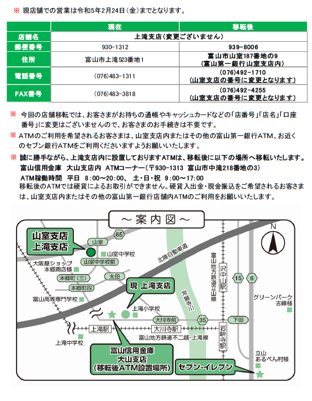 当行では、上滝支店が入居する富山市大山行政サービスセンターが移転することから、令和5年2月24日(金)にて現店舗での営業を終了し、令和5年2月27日(月)より上滝支店を山室支店内に移転して店舗内店舗方式 (1つの店舗内に2つ以上の支店が営業する方式)にて営業を開始することとなりました。