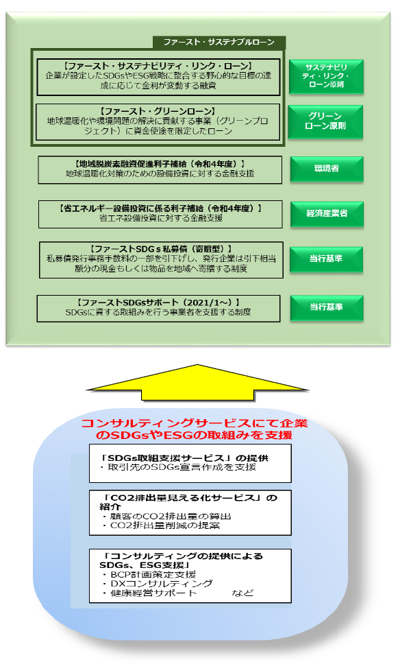 ファースト・サステナブルローンとは、取引先企業のSDGsやESGの取組みを資金面から支援するためのローンを取りまとめたものをいいます。