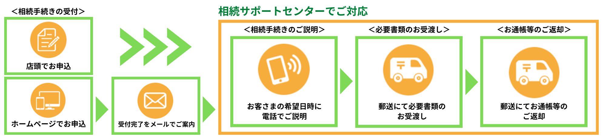 各支店またはWebで受付した相続手続きについて、必要なお手続きのご説明から、必要書類のお受渡し、解約・振込等手続き完了まで一括で対応いたします。