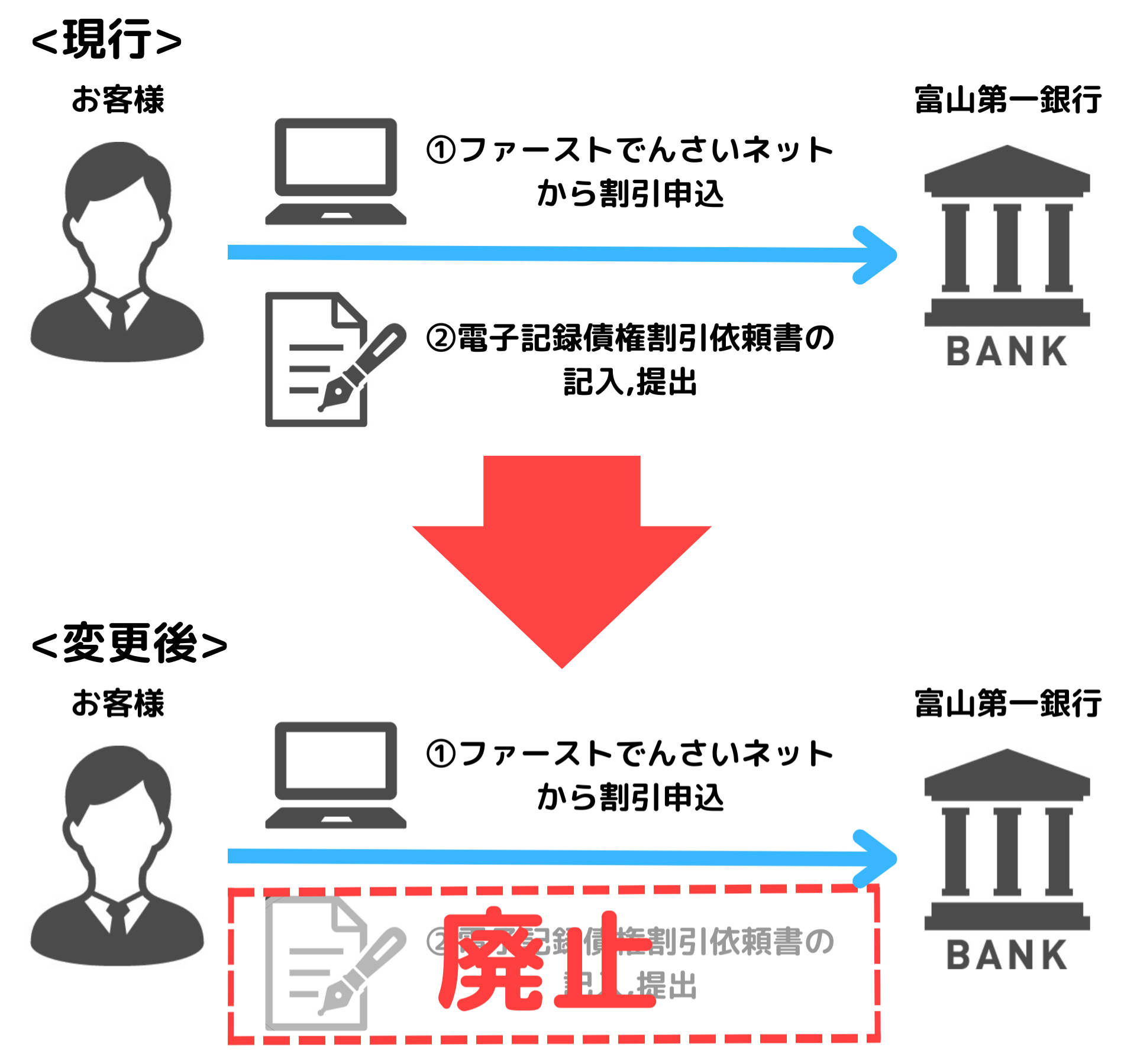 ファーストでんさいネットにて「でんさい割引」をお申込の際にお客様にご提出をいただいておりました「電子記録債権割引依頼書」を廃止します。