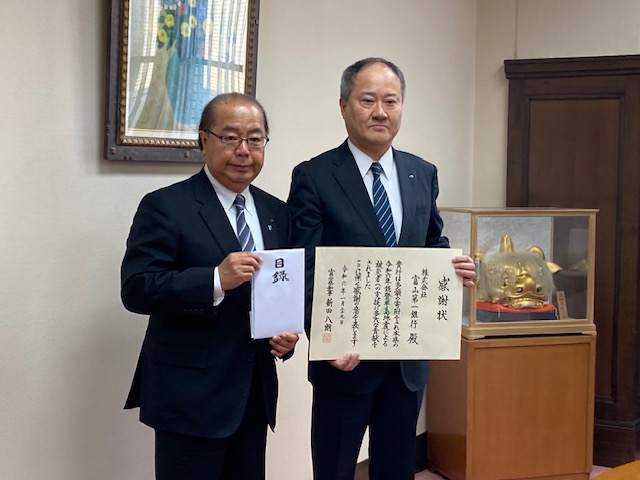 | (左)富山県 新田八朗 知事 (右)富山第一銀行 野村充 取締役頭取 |
