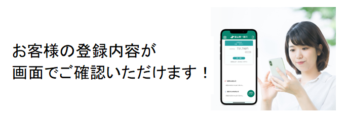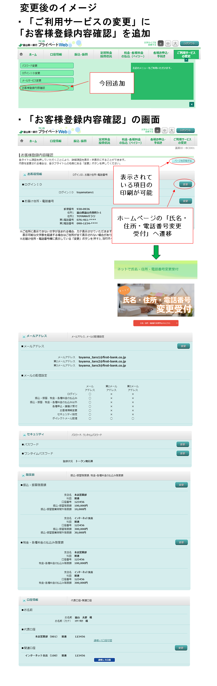銀行へのお届出事項(住所・電話番号等)やメールアドレス等の登録事項を、お客様自身がプライベートWeb上の一つのページで一覧表示・ご確認ができるようになります。 変更がある場合は「変更」ボタンからホームページでの変更手続きが可能となります。「お客様登録内容確認画面」は印刷可能であり、勤務先等への口座番号の提出等にも対応します(パソコンのみ)。