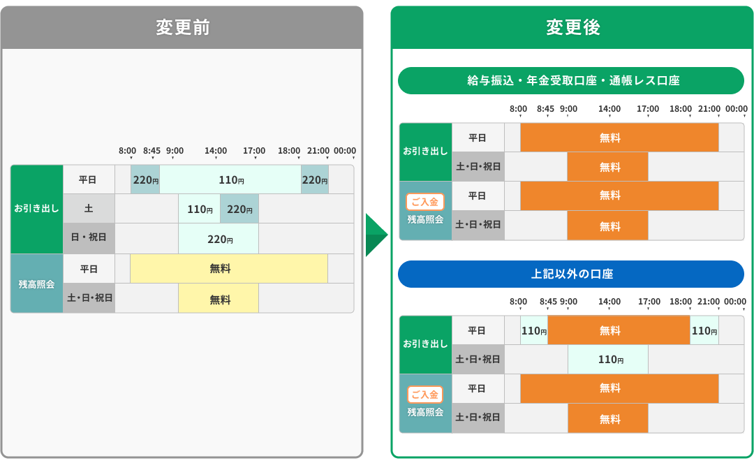 「上記以外の口座のお客さま」は、お引き出しにつきましては平日時間内(8:45~18:00)が無料、平日時間外および土日祝日は時間外手数料(110円)がかかります。ご入金につきましては終日無料でご利用いただけます。