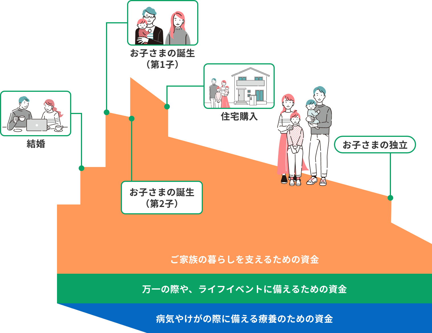 お⼦さまの成⻑に伴い、必要となる保障の内容も少しずつ変わっていきます。
