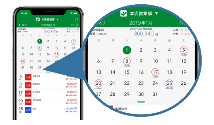 富山第一銀行の口座と各種クレジットカード情報をカレンダー形式で直感的に閲覧できます。